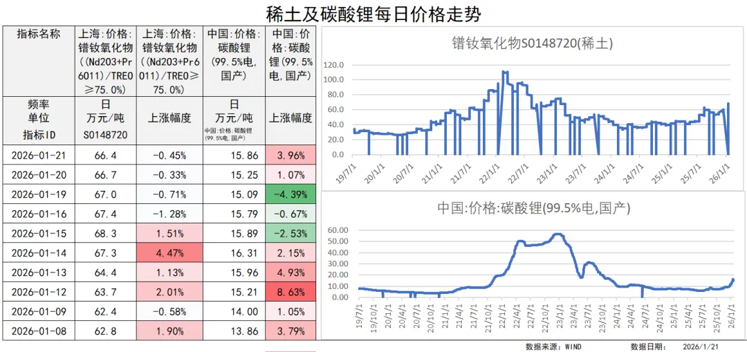 4、镨钕氧化物(稀土)价格昨日下跌0.45%,碳酸锂价格上涨3.96%。