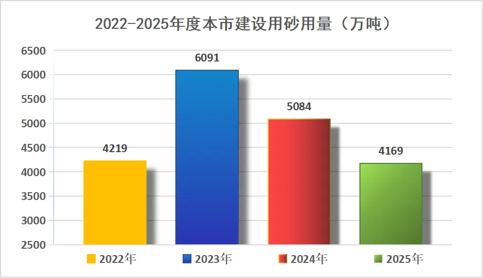 1、2025年度本市建设用砂合计使用量4169万吨,同比2024年度的使用量减少18.0%。本市建设用砂需求呈“持续收缩、降幅扩大、季度同步”的特征,反映城市建设从增量转向存量、行业从规模扩张转向质量提升的阶段变化。