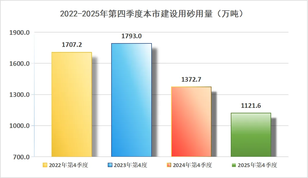 2、2025年第四季度本市建设用砂合计使用量1121.6万吨,同比2024年第四季度的使用量减少18.3%。单季降幅与全年同步,无明显季节性反弹,建设用砂总量年末收缩趋稳。