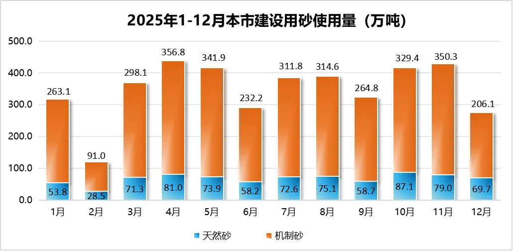 2025年1-12月本市建设用砂仍以机制砂为主,占比81%,细、中、粗砂使用量比例分布与混凝土配合比相符。