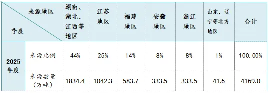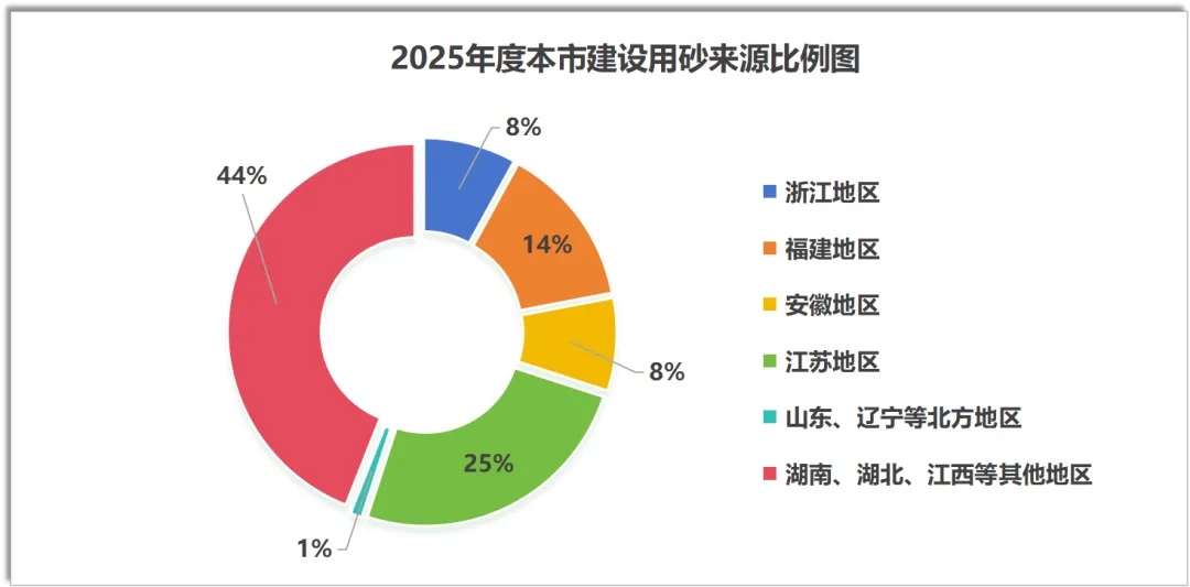 3、2025年本市建设用砂来源呈现显著的区域集中特征,形成了以长江经济带为核心、东南沿海为补充的供应格局。从占比分布看,湖南、湖北、江西等长江中游及内陆地区以44% 的占比成为第一大砂源地;江苏作为长三角砂源交易枢纽,占比达25%(含经当地中转交易的砂源);福建、浙江、安徽分别以14%、8%、8%的占比构成次要供应区域;而山东、辽宁等北方地区供应量占比最低,处于边缘补充地位。