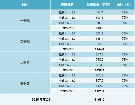 根据供应商质保书数据,2025年1-4季度本市建设用砂使用粗中细分布情况:
