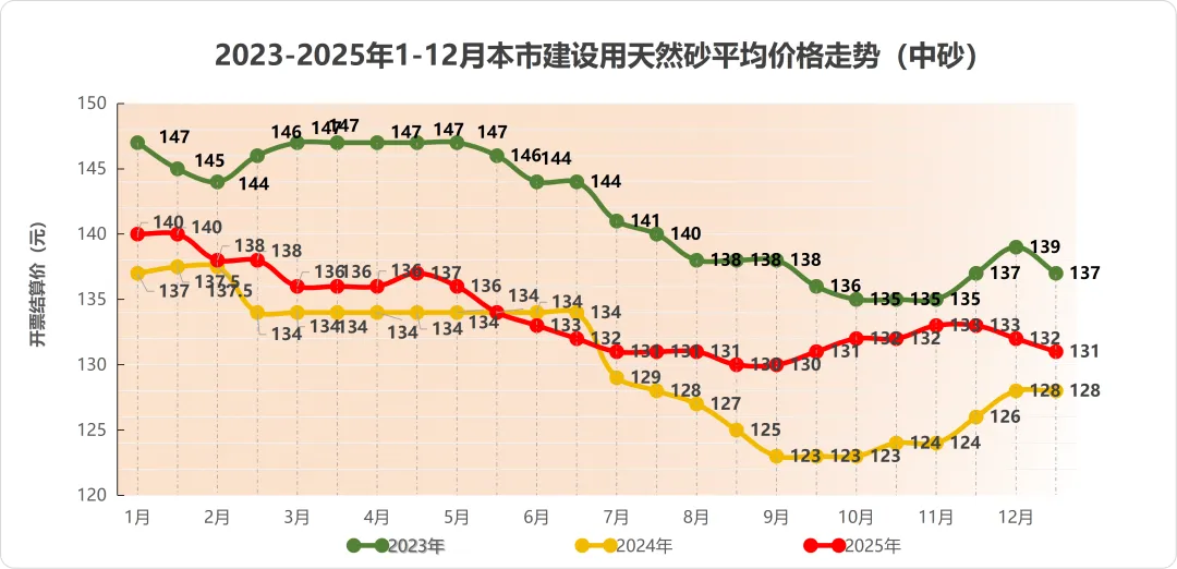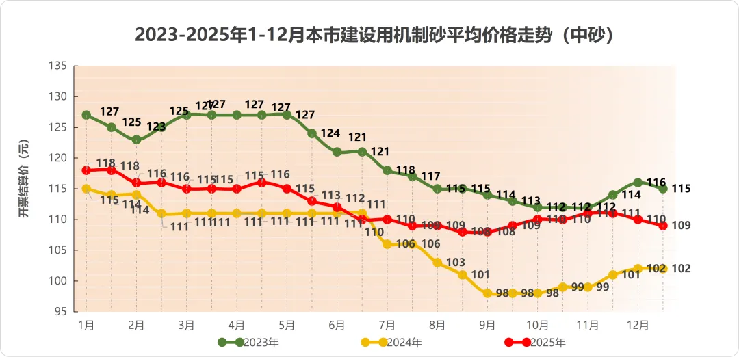 6、2025年度本市建设用天然砂中砂龙吴路调研均价117元/吨,搅拌站开票结算均价129元/吨,同比2024年度天然砂价格增长3.2%;机制砂中砂龙吴路调研均价97元/吨,搅拌站开票结算均价107元/吨,同比2024年度机制砂价格增长4.9%。