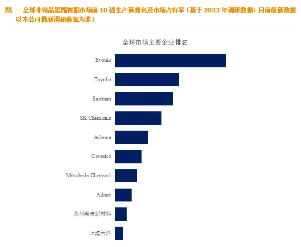全球范围内,非结晶聚酯树脂主要生产商包括Evonik、Toyobo、Eastman、SK Chemicals和Arkema等,其中前五大厂商占有大约52%的市场份额。