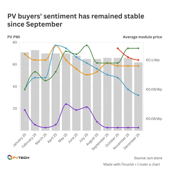 该公司指出,任何高于50的PV PMI得分都表明市场普遍认为未来几个月市场将增长,因此62这一数字并不意味着行业普遍存在负面情绪。然而,12月的PV PMI指数比前三个月的每期均低4个点,且比2025年2月创下的73这一历史最高值低10多个点。
