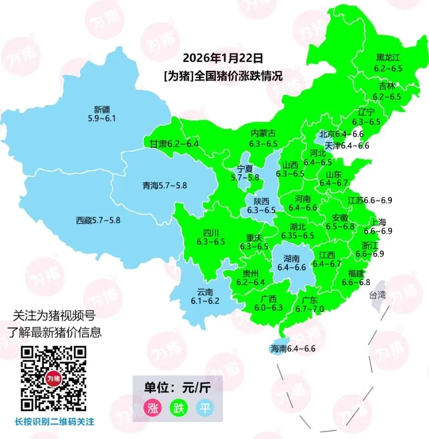 今日全国生猪收购均价呈现下跌态势,标准体重生猪平均价格为6.47元/斤,环比昨日下跌0.08元/斤,上涨地区0个,下跌地区21个,稳定地区7个,全国生猪收购最低价为新疆,价格为5.7元/斤,最高价为上海,价格为6.8元/斤。