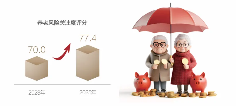 随着近年来老龄化社会加深、渐进式延迟退休方案的发布,养老问题越发得到大家关注。在各类财富管理法律风险中,中高净值人群最担心养老风险,关注度评分更是从2023年的70.0提升至2025年的77.4。