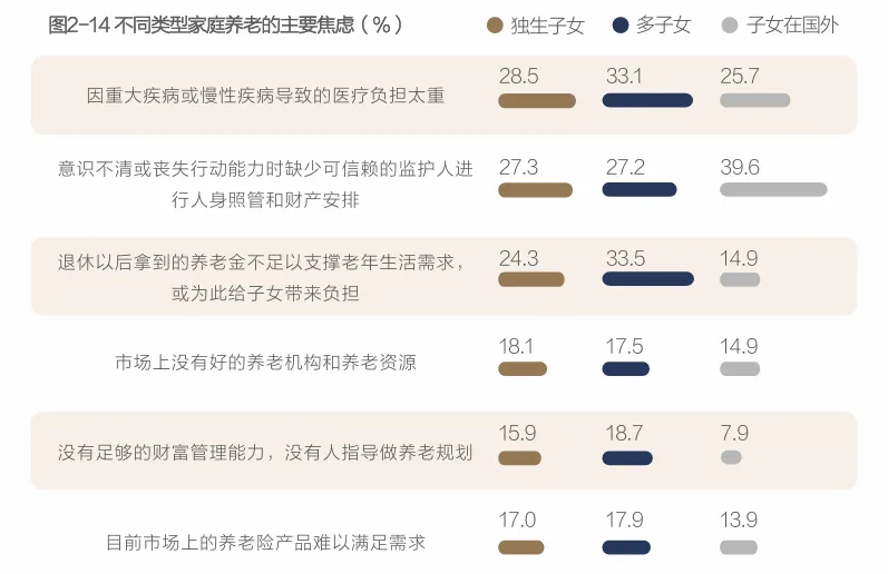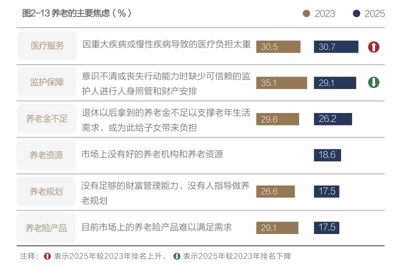 在养老焦虑方面,没钱、没人、没尊严问题是压垮中高净值人群晚年生活的三座大山。知名作家在病痛缠身时主动选择体面、有尊严地离开;上海老人通过意定监护和遗赠扶养协议将价值300万元的房产及其晚年生活照护,全数托付给家附近的一位水果摊主等事件更是说明了养老有尊严、有人照顾的重要性。数据显示,疾病导致医疗负担太重是中高净值人群最大担忧;其次是缺少可信赖的监护人进行人身照管和财产安排,占比均在30%左右。