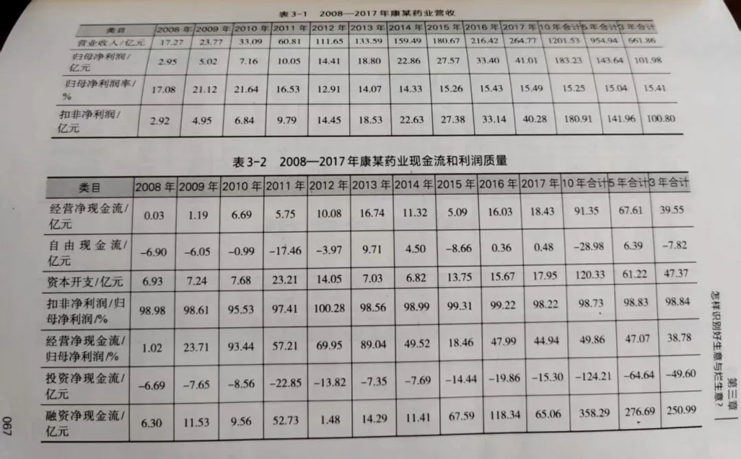收入看营业收入,利润看归母净利润和扣非净利润。收入代表企业规模,在一定程度上,企业规模大小由收入决定;利润代表企业的盈利能力。如表3-1所示,2017年康某药业收入为264.77亿元,归母净利润为41.01亿元,归母净利润率为15.49%。从数据看,这是家大公司,利润高,盈利能力强。2008-2017年的10年间,收入从17.27亿元增长到264.77亿元,增长14.33倍,归母净利润从2008年的2.95亿元涨到41.01亿元,涨了12.90倍。利润率在规模扩张后略有下降,2015-2017年的3年间维持在15%以上。