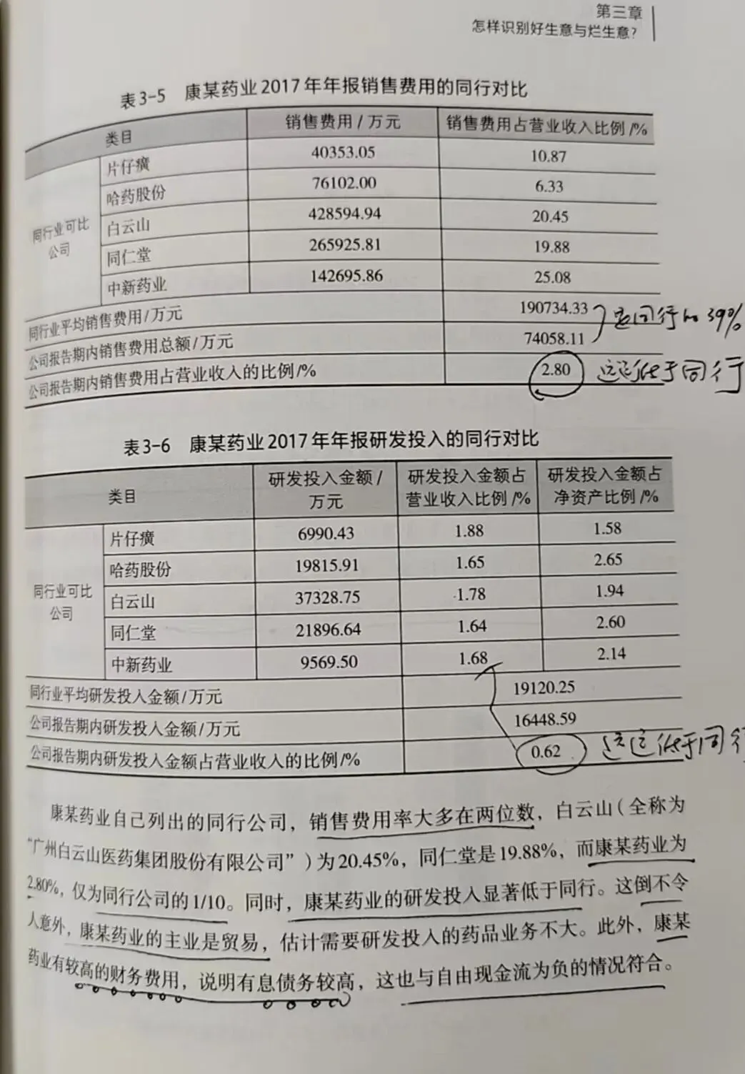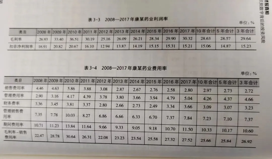 2017年康某药业的毛利率为30.32%,归母净利润率为15.49%,说明期间费用率很低。从表3-4数据看,2017年销售费用率只有2.80%,2015-2017年的3年间只有2.72%。对于一家以贸易为核心业务的公司来说,销售费用率很低是正常的吗?2017年年度报告中有可比公司的销售费用率(见表3-5、3-6)。