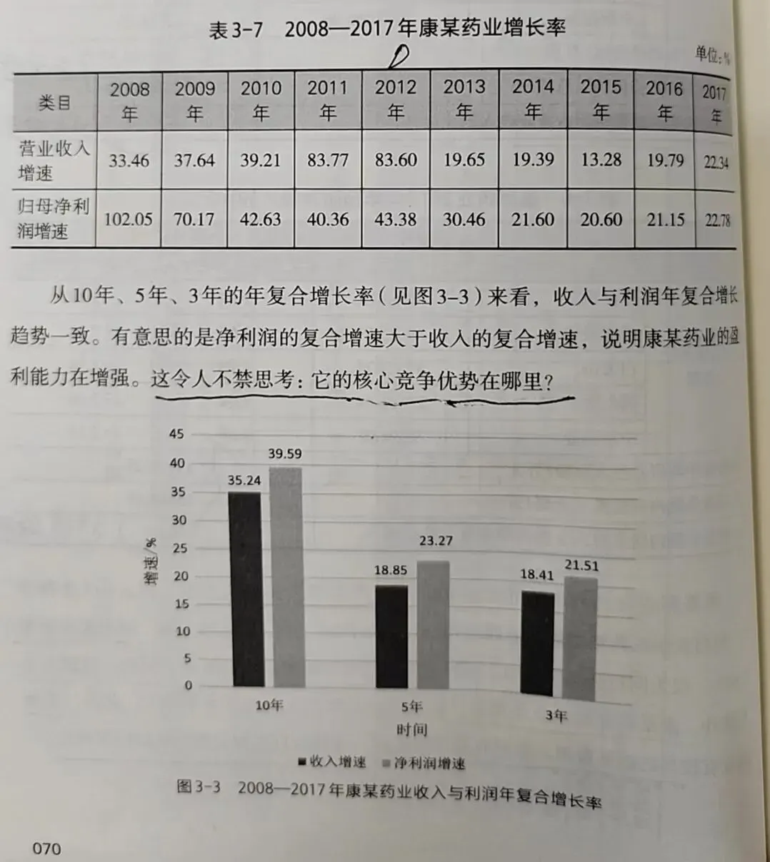 如表3-7所示,康某药业的营业收入增长率和利润增长率逐渐走低。这符合商业常识——大部分企业达到一定规模后增长率会下降。近几年营业收入和利润增长率不再下降,保持在20%左右。20%的增长率对于一家收入过200亿元、利润过几十亿元的大公司而言也相当不错了。