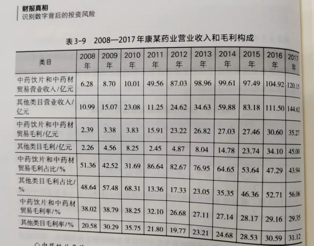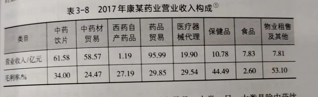 从2017年康某药业年报的业务介绍中,我们知道康某药业是多种业务混合经营,因而看业务构成就成了理解康某药业核心驱动力的关键窗口。2017年年报披露的业务分类和毛利率如表3-8所示。