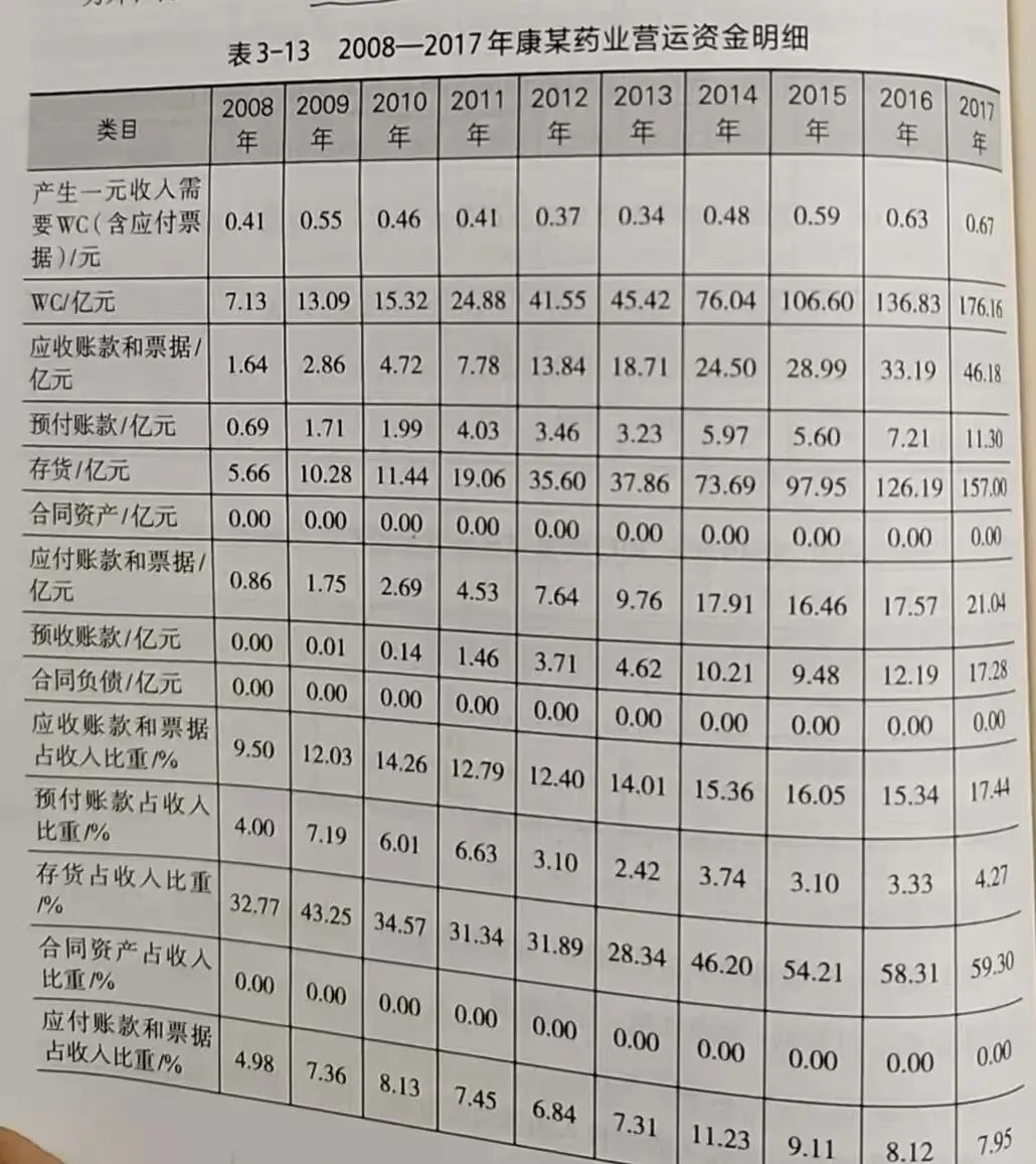 从表3-2中可以看到,扣非净利润/归母净利润10年合计98.73%,说明利润主要来自持续经营活动。经营净现金流始终为正,但与归母净利润之比较低,10年合计只有49.86%,说明利润转化为现金的能力弱,且2015-2017年的3年合计数据为38.78%,呈现恶化趋势。自由现金流表现不佳,10年合计-28.98亿元。说明10年间的收入利润大幅扩张并没有带来真实的现金流,生意模式不能内生自洽,说明康某药业的盈利质量不高。