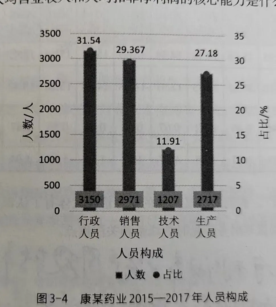 图3-4和图3-5为康某药业2015-2017年3年人员构成和收入平均数据。