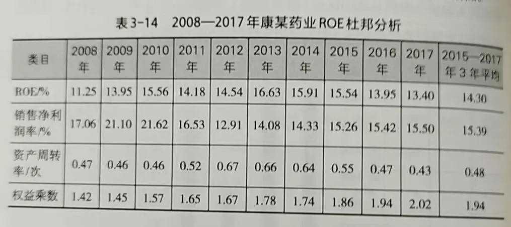 康某药业的ROE还行,2015-2017年3年平均为14.30%。采用杜邦分析法将ROE拆成销售净利润率、资产周转率和权益乘数来观察(见表3-14),康某药业较高的ROE主要来自较高的销售净利润率和较高的权益乘数,而周转率显然偏低。
