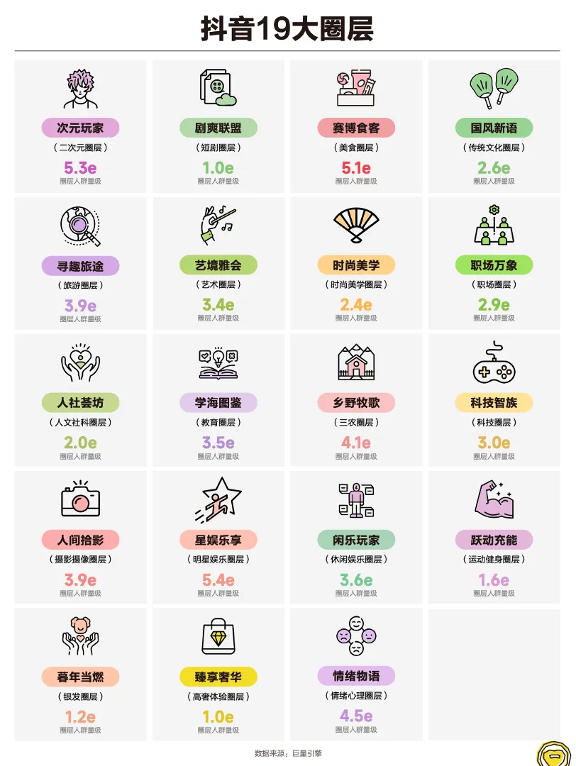 在当下的营销环境中,兴趣圈层的重要性空前凸显。它超越了传统的人口统计或消费能力划分,直接切入消费者的精神世界与生活方式。基于主动内生与被动外驱的需求类型,以及物质型与体验型的消费类型,抖音生态中生长出19大核心兴趣圈层,覆盖超过200个细分人群。