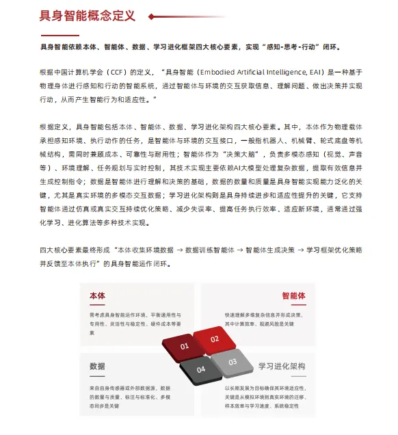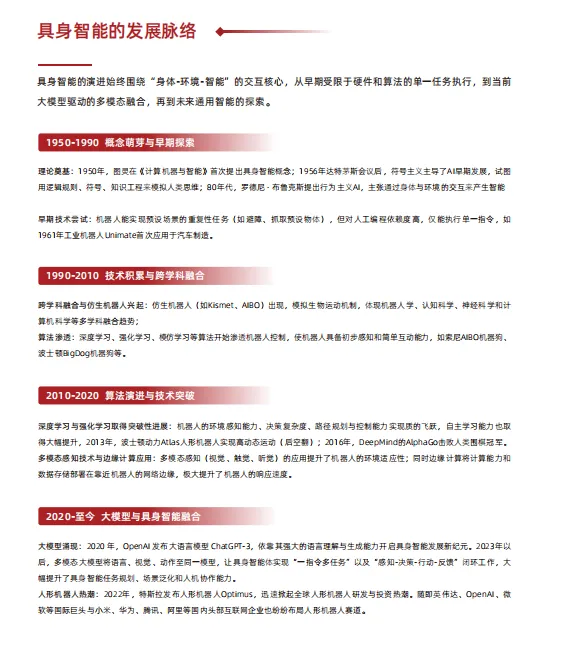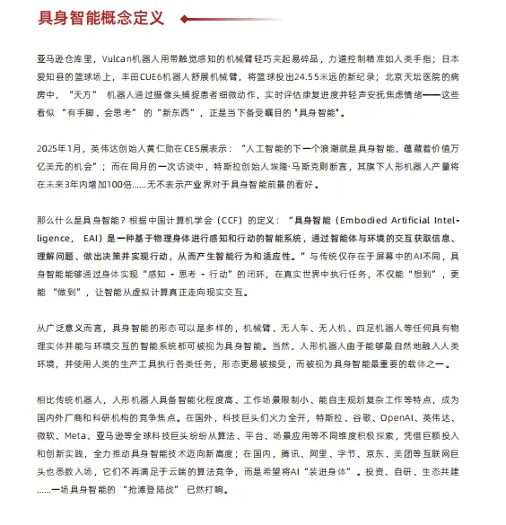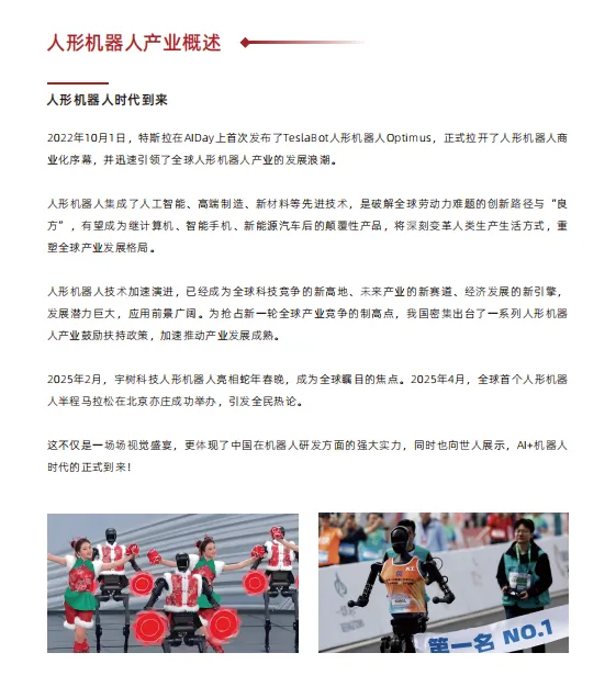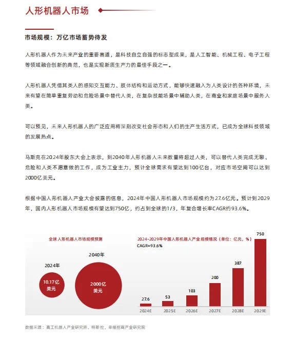 《2025人形机器人行业白皮书》由幸福招商行业研究院编制,系统梳理了“具身智能”从学术概念到万亿级产业赛道的完整演进。报告以“躯体觉醒”为隐喻,指出当大模型这颗“数字大脑”植入高性能关节、传感器与能源系统构成的“钢铁身躯”时,人形机器人正式跨越科幻边界,成为继计算机、智能手机、新能源汽车之后第四大通用技术平台。全书8大章节、104页、50余张产业链图谱,逐一拆解“大脑-小脑-肢体”技术栈、上游核心零部件成本结构、五路产业大军竞争格局以及“工业制造-商用服务-极端作业”三大场景阶梯式落地路径,并给出2024-2029年国内市场规模CAGR 93.6%、2040年全球需求100亿台、市场空间2 000亿美元的量化预测,为政府招商、企业布局、资本投资提供了一份“技术-商业-政策”三维坐标系下的权威路线图。