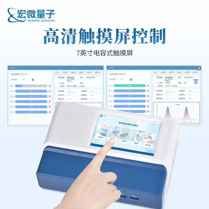 - HW-LZ1 配备10.1英寸高清触摸屏,内置8孔恒温孵育器,支持单通道荧光检测。仪器内置标准曲线,无需外接标准品,适用于粮油、饲料、牛奶等样品的真菌毒素定量检测,具备良好的稳定性与重现性。