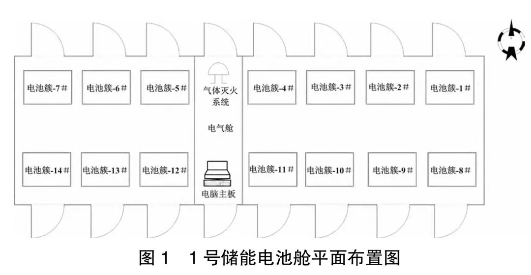每座储能电池舱长13.7m、宽2.43m、高2.95m,南、北两侧共设有16个箱门,每个箱门对应一簇电池组,其中北侧由东向西设有1~7簇电池组,南侧由东向西设有8~14簇电池组;中间部位设有电气舱,电气舱内北侧为气体灭火系统、南侧为电脑主机装置(见图1)。