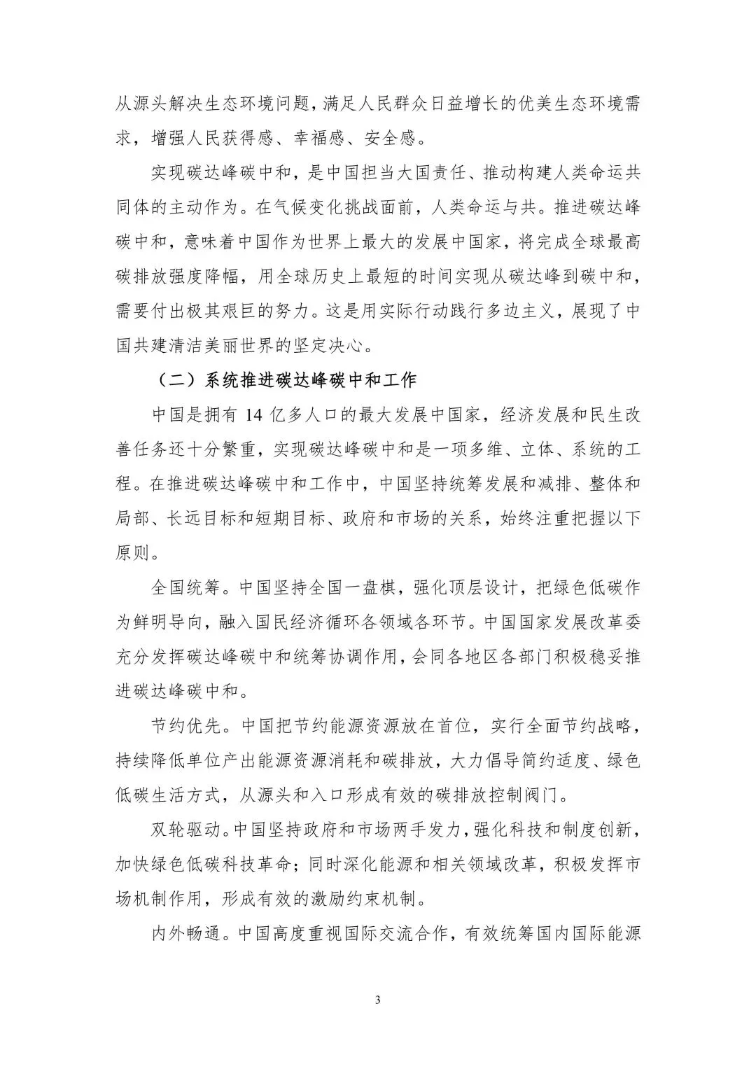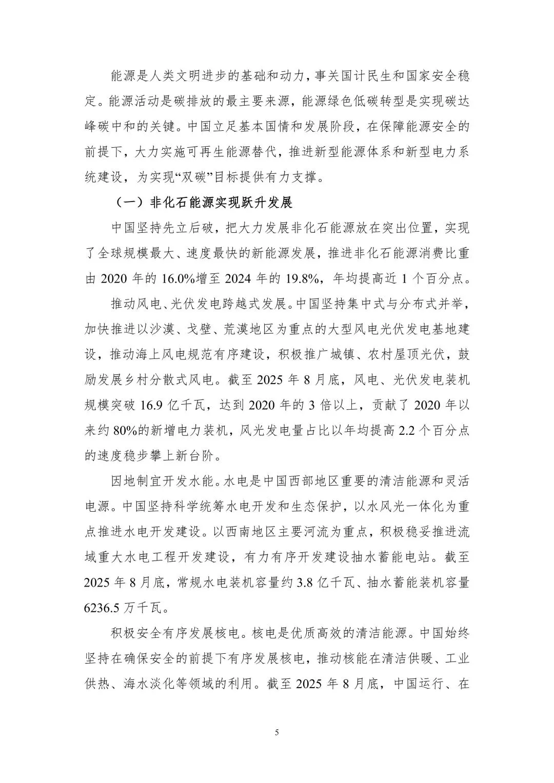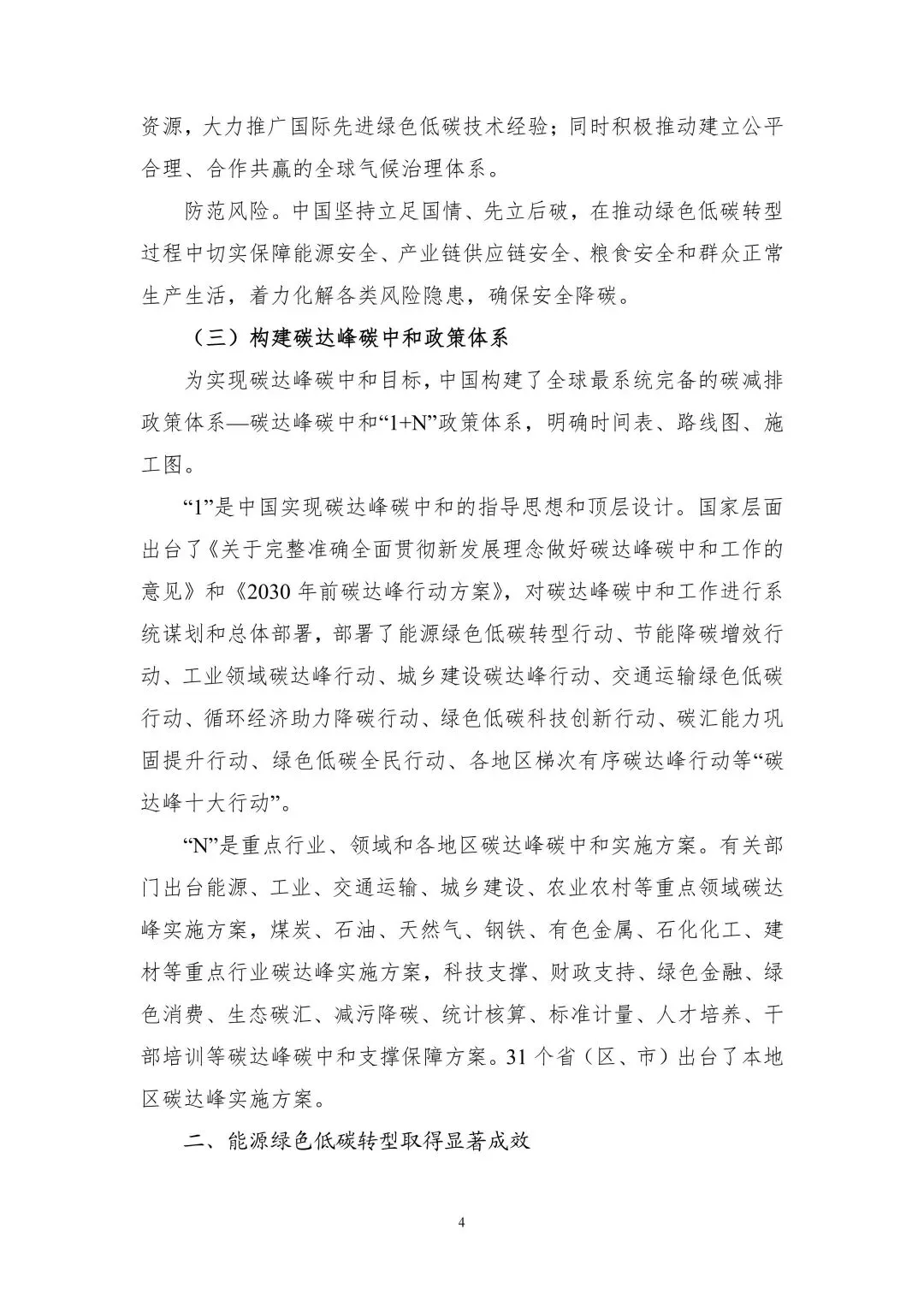 白皮书指出,能源活动是碳排放的最主要来源,能源绿色低碳转型是实现碳达峰碳中和的关键。中国立足基本国情和发展阶段,在保障能源安全的前提下,大力实施可再生能源替代,推进新型能源体系和新型电力系统建设,为实现“双碳”目标提供有力支撑。