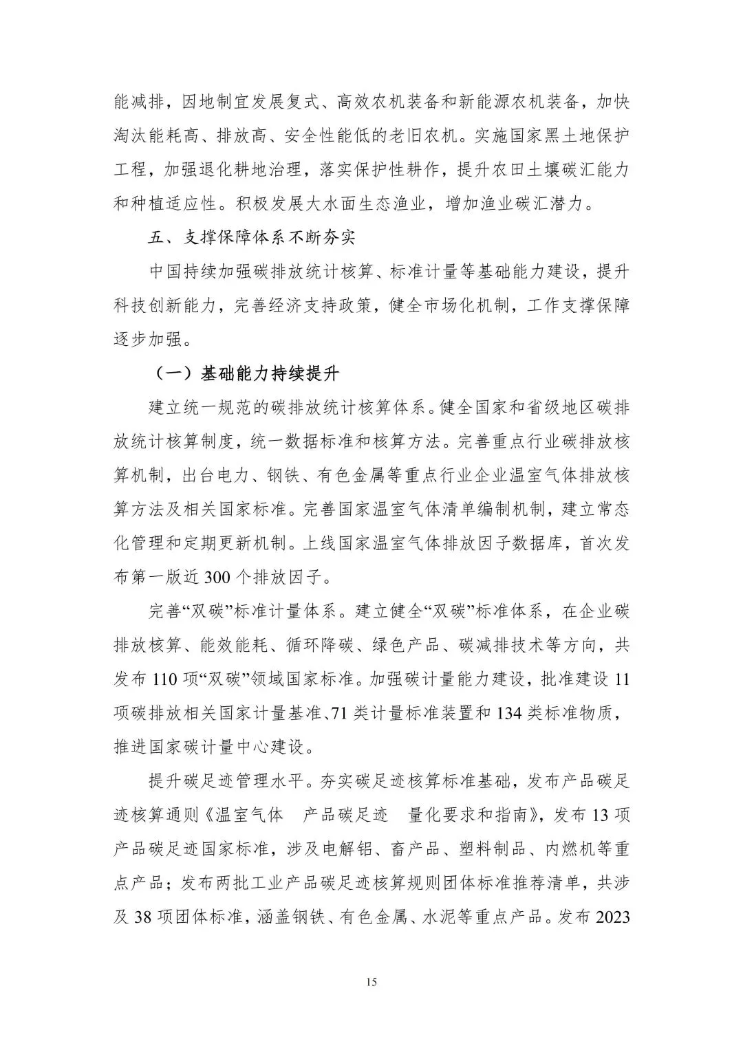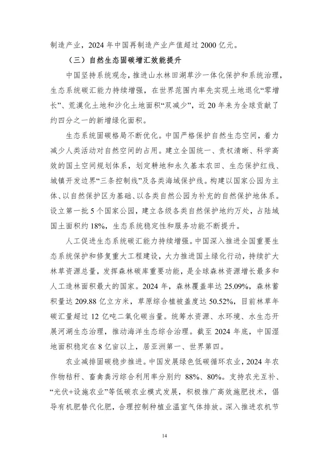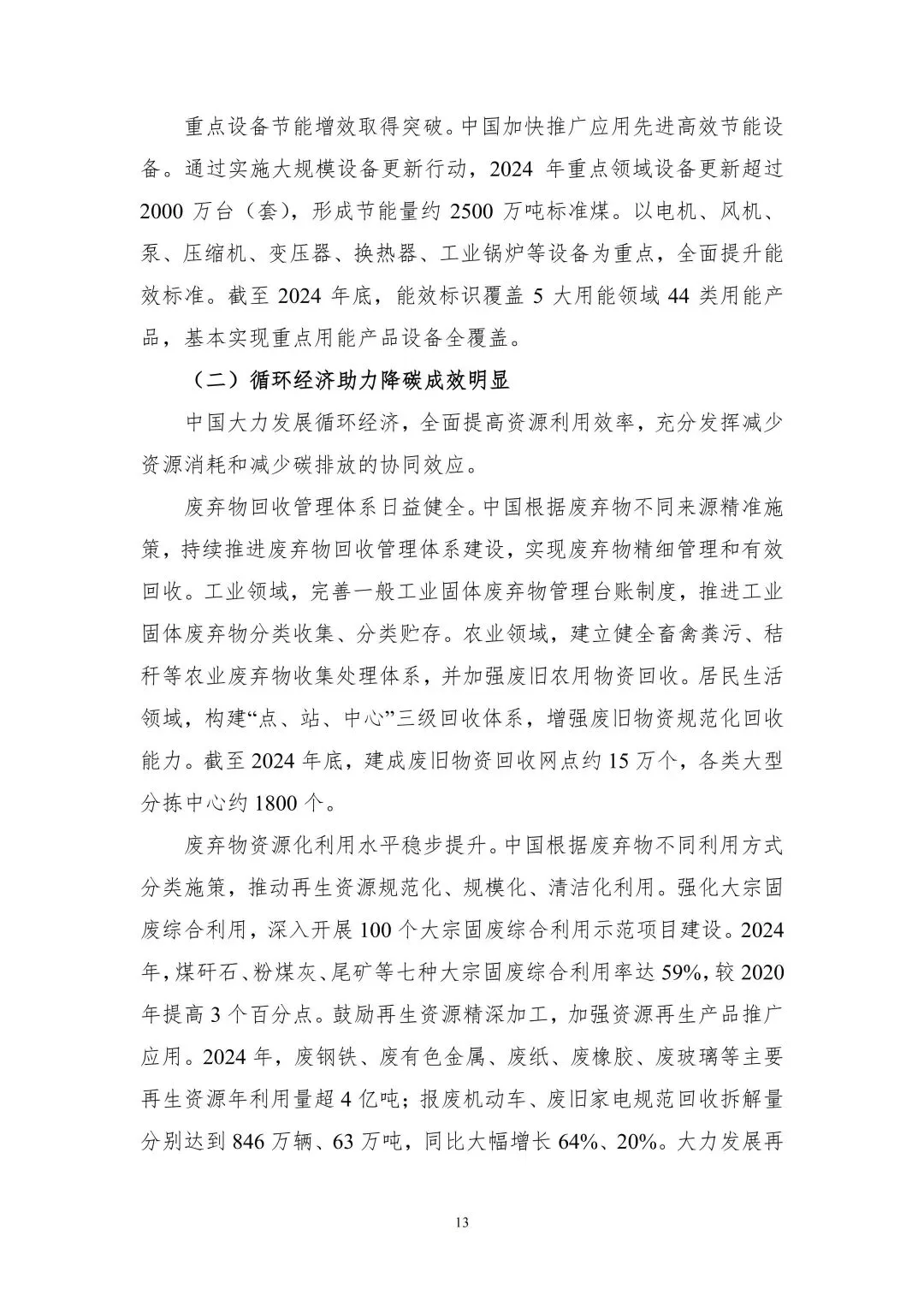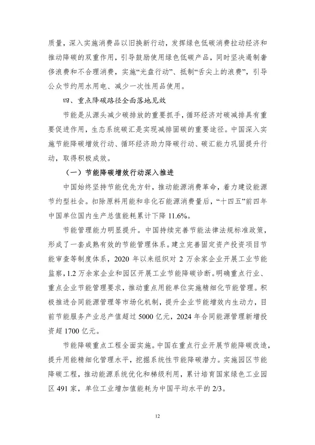 白皮书说,节能是从源头减少碳排放的重要抓手,循环经济对碳减排具有重要促进作用,生态系统碳汇是实现减排固碳的重要途径。中国深入实施节能降碳增效行动、循环经济助力降碳行动、碳汇能力巩固提升行动,取得积极成效。