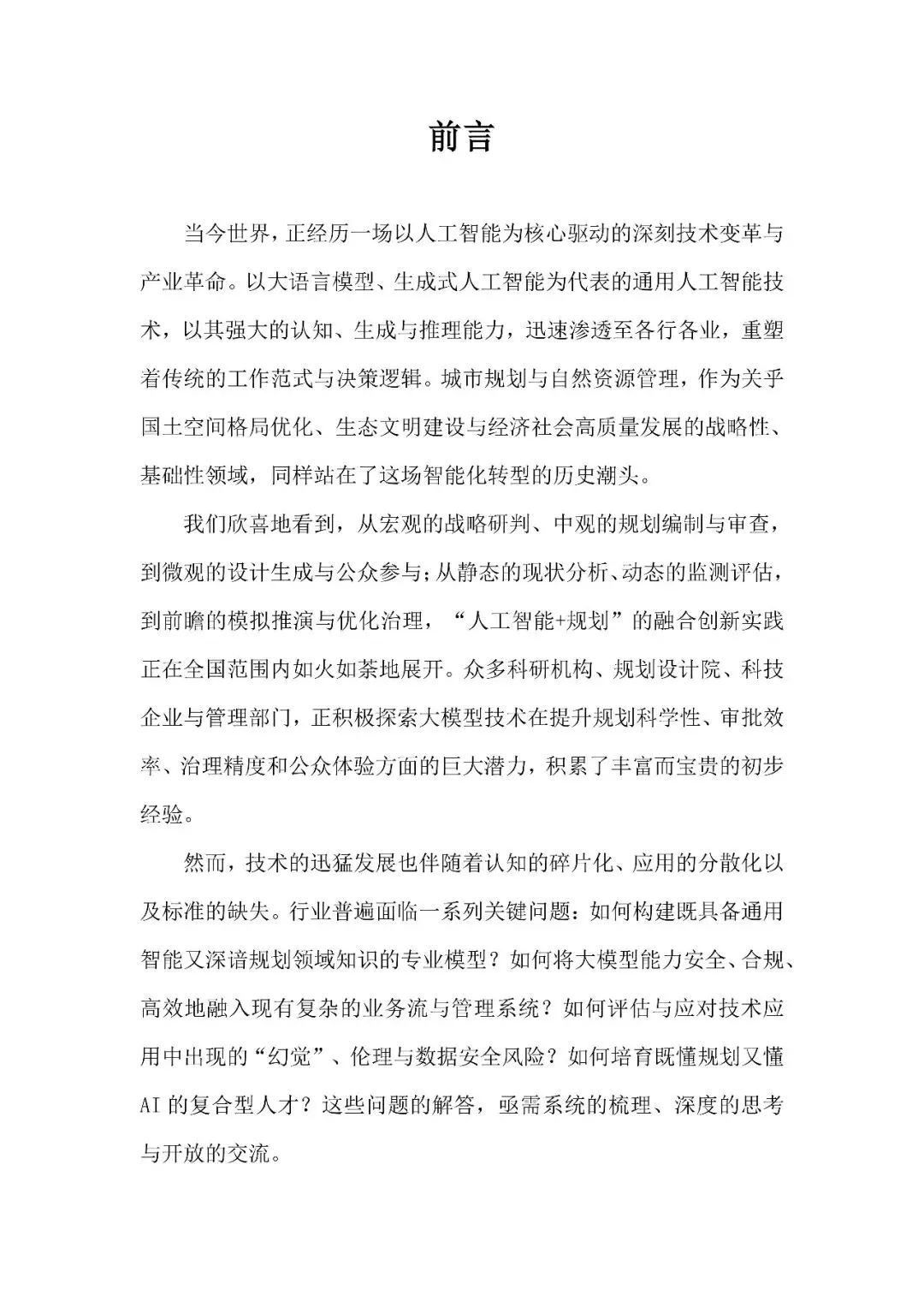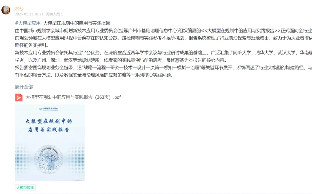 由中国城市规划学会城市规划新技术应用专业委员会(挂靠广州市基础地理信息中心)组织编纂的<<大模型在规划中的应用与实践报告>>正式面向全行业发布。针对当前规划领域在大模型应用过程中普遍存在的认知分散、路径模糊与实践参考不足等挑战,报告系统梳理了行业前沿探索与落地成果,致力于为从业者提供一份聚焦实施路径的务实指引。 新技术应用专业委员会依托其行业平台优势,在深度整合近两年学术会议与行业研讨成果的基础上,广泛汇集了同济大学、清华大学、武汉大学、华南理工大学等高校学者,以及广州、深圳、武汉等地规划院所一线专家的实践案例与前沿思考,最终凝练为本报告的核心内容。 报告紧密围绕规划业务全链条,沿"战略一流程一研究一技术一设计一决策一感知一模拟一治理"等关键环节展开,系统阐述了行业大模型的构建路径、与GIS及CIM等现有平台的融合方法,以及数据安全与伦理风险的应对策略等一系列核心实践问题。 报告不仅对技术应用展开讨论,更前瞻性地审视了大模型如何驱动规划行业从"经验驱动"向"数据与知识双驱动"的范式转型。基于所汇集的实践案例,大模型在辅助方案生成、自动合规审查、城市动态模拟及智能公众参与等场景中,已展现出提升效率、优化决策的显著价值,从而为规划行业的智慧化转型提供了清晰可行的演进路径。 本报告以开放形式发布,旨在促进行业知识共享与实践对话。全文可通过中国城市规划学会官网及微信公众号下载获取。专业委员会将持续跟踪实践发展,推动行业认知迭代与协同进步。公号后台回复“9”,在AI大模型·领地知识星球查看~