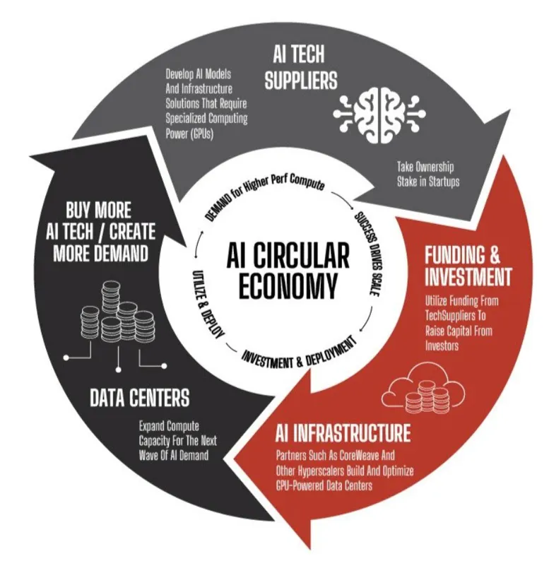 更值得关注的是,"循环融资"模式正在助长泡沫膨胀。这种自我强化的商业策略表现为:企业通过投资自身客户以加速其增长,而客户增长又反向推动对企业产品的需求,最终形成营收增长与初始投资回报的闭环。