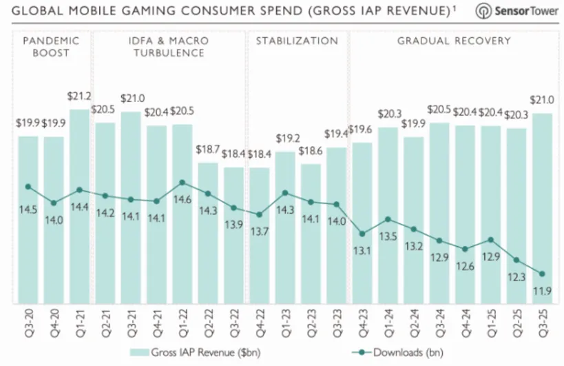 基于前述预测背景,2026年移动游戏将仅维持2-4%的微幅增长,且西方发行商无重大新作面世。在单次安装成本持续攀升的压力下,下载量预计将同比下降8%,迫使游戏采取更激进的变现策略。