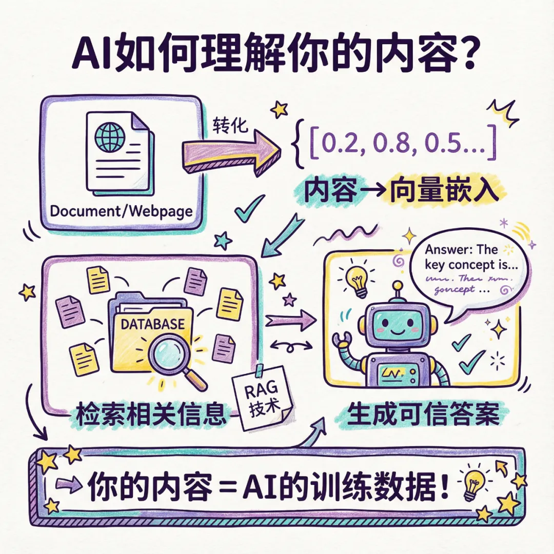 这意味着什么?你的每一篇博客、每一份白皮书、每一个产品说明,都可能成为AI的"训练数据"和"引用来源"。