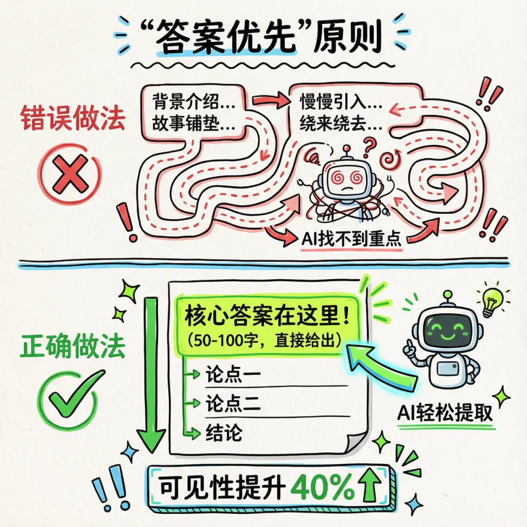 如果说传统写作是讲故事——先铺垫背景,营造悬念,最后揭晓答案——那么GEO时代的写作就是"开门见山,答案先行"。