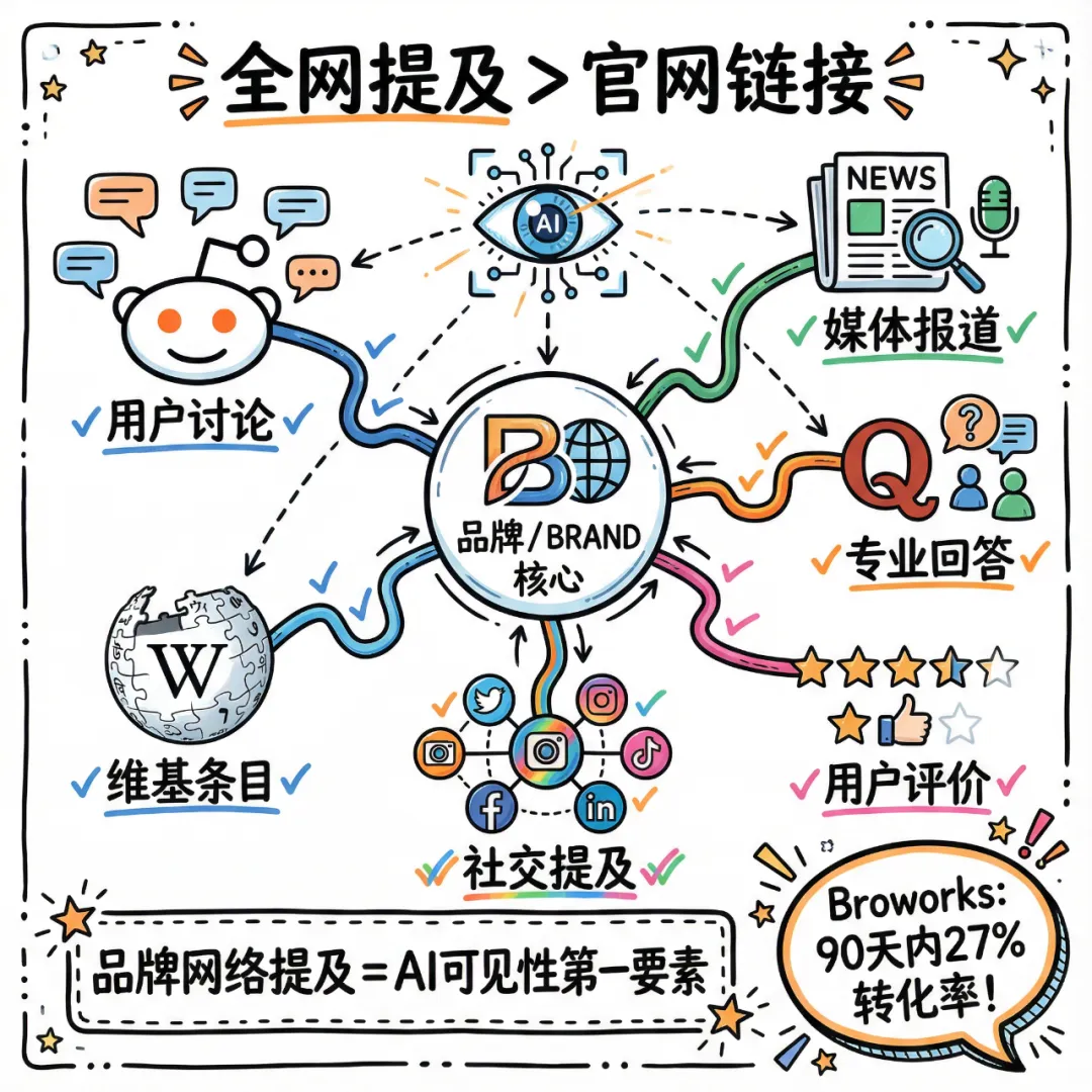 研究明确指出,"品牌网络提及"是与AI可见性关联度最高的因素。这意味着: