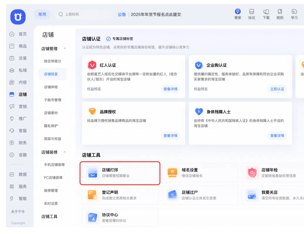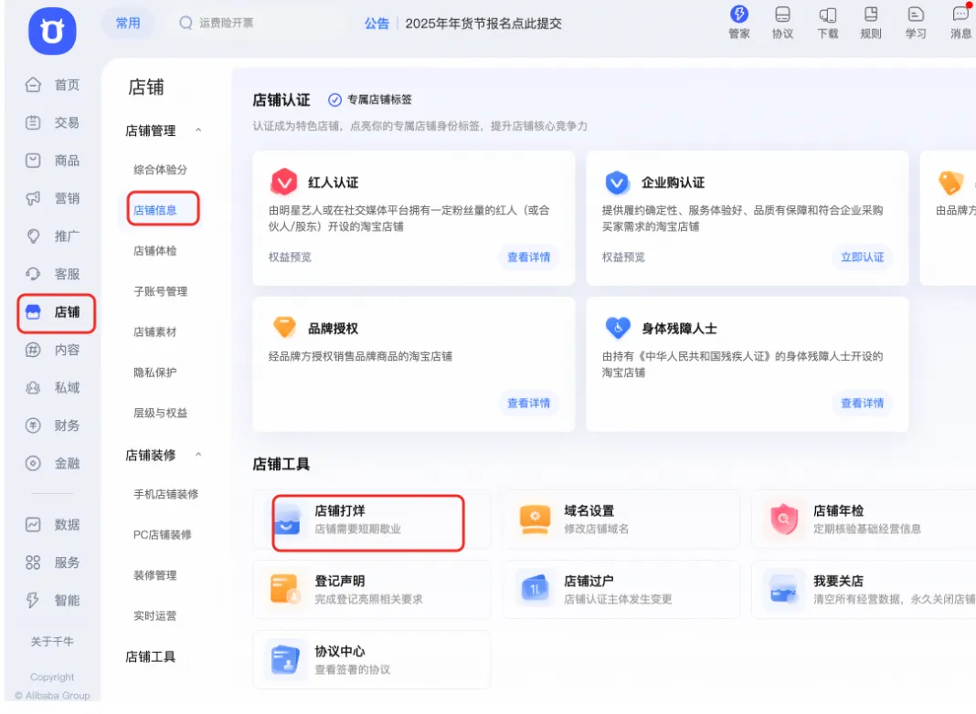 淘宝店铺打烊入口: 卖家工作台-店铺-店铺信息-营业店铺打烊,您可到此链接