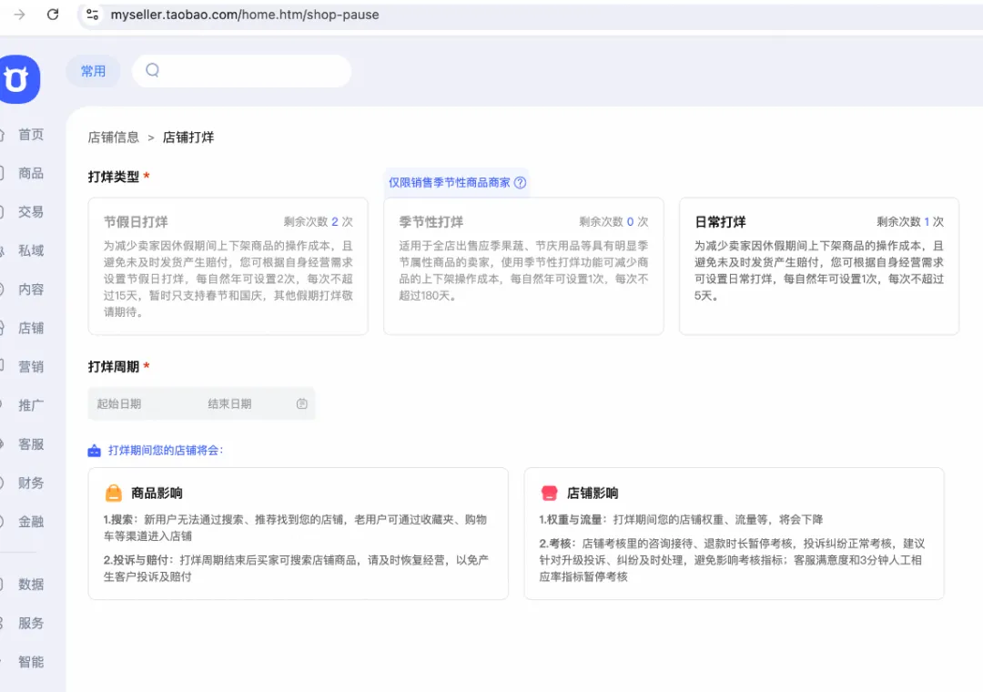 温馨提示:目前季节性打烊处于试点阶段,全店出售应季果蔬、节庆用品等商品的部分商家开放季节性打烊功能,其他商家暂不支持主动申请,敬请关注。