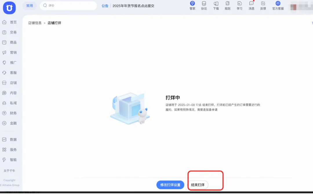 直达淘宝店铺打烊入口,若您需要恢复经营,您可以点击结束打烊。