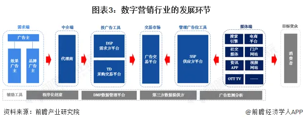 数字营销环节从广告主至受众的流程中经历了多个发展环节。在现有的数字营销模式中,由于广告主与媒体之间信息不对称导致的互不信任,需要中间代理商作为沟通渠道建立与维系广告主与媒体间的关系。因此广告主抵达受众需要经过“需求端-中介端-需求方平台-广告交易市场-供应方平台-媒体端-目标受众”这个较复杂的流程。