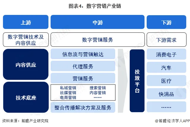 结合数字营销发展环节和企业业务架构,数字营销产业链可以划分为上游底层技术及内容供应,中游数字营销服务及下游需求三大环节。其中,中游服务模式呈现出多样化发展的特征,代表性的包括信息流与营销触达、代理服务、营销服务及整体传播解决方案及服务等多种类厂商,依托投放平台,将数字营销内容传递至目标受众。