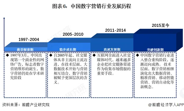 中国数字营销行业在二十余年的发展历程中共经历了萌芽探索期、稳步成长期、高速发展期、突破创新期四个阶段,数字营销已经从理论概念发展到今天不断融合大数据、云计算、人工智能、区块链、VR/AR等新兴技术的关键行业。