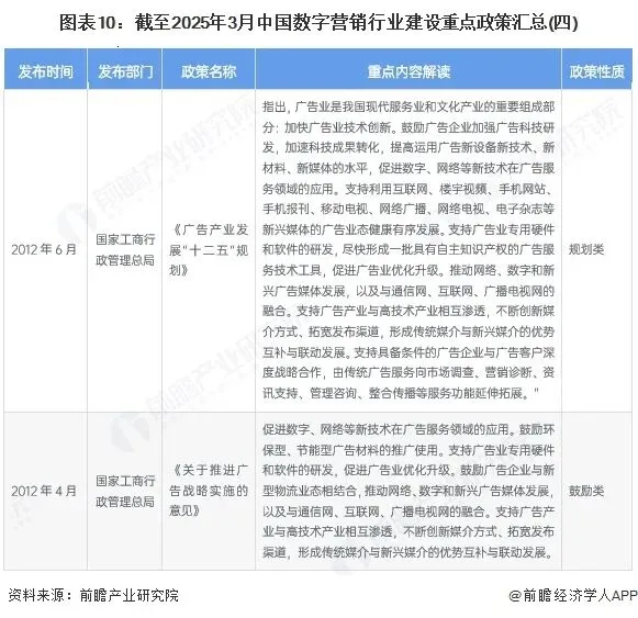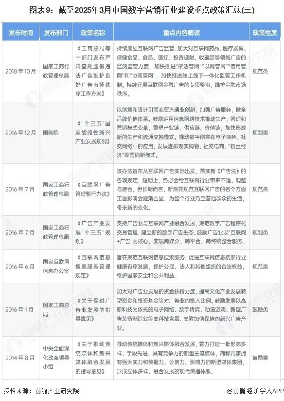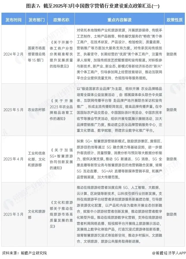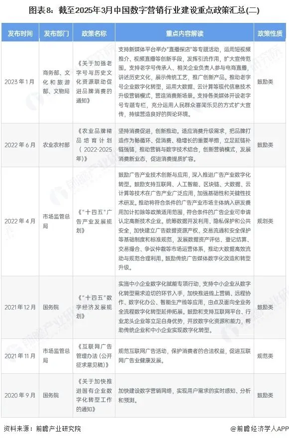 当前,相关政策的出台完善行业相关制度,使行业驶入规范、有序的稳定发展,为重振行业市场释放大量利好。数字经济发展已经成为中国落实国家重大战略的关键力量,对实施供给侧改革、创新驱动发展战略具有重要意义。作为数字经济重要组成部分,数字营销行业也在国家相关政策推动下实现了新突破。当前,我国主要以依托数字技术推动营销模式创新为核心出台政策,促进数字营销进一步服务旅游、农业、跨境电商等下游产业,具体政策汇总如下: