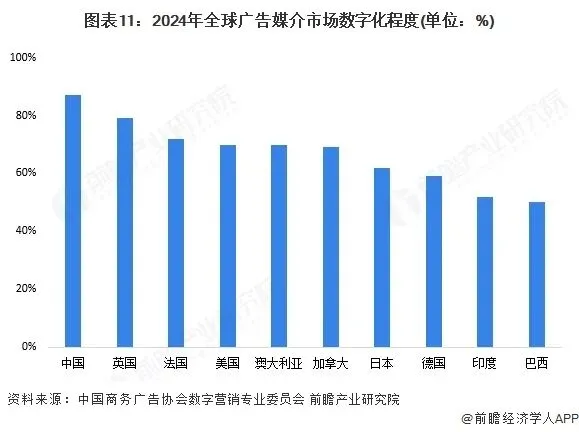 根据中国商务广告协会数字营销专业委员会的数据,依托数字经济的飞速发展,我国广告营销媒介数字化程度呈迅猛发展的趋势,短视频、直播带货等数字营销媒介推动中国以数字广告为代表的数字营销行业跃升至全球领先地位。2024年,中国广告媒介市场数字化程度达到了87%。