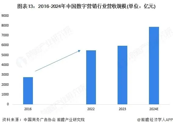 在中国数字经济的发展背景下,数字营销已成为最重要的营销方式,下游行业数字营销费用占比不断攀升。随着技术和移动互联网的发展与普及,营销早已不是单纯地投放广告,而是企业围绕消费者需求形成运营闭环的整套过程。后疫情时代,数字经济和消费结构转型升级,随着线上线下全渠道消费趋势加速,新零售O2O市场蓬勃发展,数字营销服务行业迎来机遇。结合中国商务广告协会的数据,初步统计到2024年,中国数字营销行业的市场规模超过7800亿元。