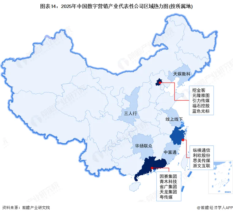 从我国数字营销上市企业区域分布情况来看,数字营销产业链代表性企业多在我国东部沿海地区省份分布。其中,广东省和北京市的代表性厂商分布最为密集,聚集了一批领先的中游厂商,除此之外,浙江省亦聚集了一批经营规模较大,具有较强实力的厂商。