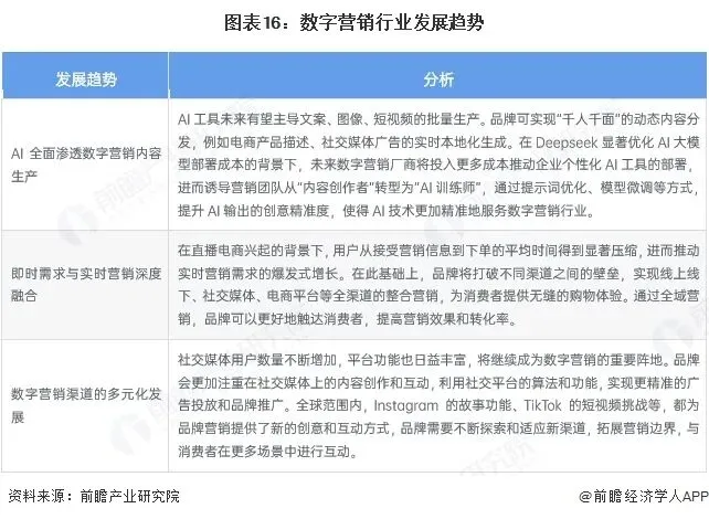 行业发展前景及趋势方面,AI技术推动了数字营销行业的革新,行业在内容生产、营销方式、营销渠道等方面均将会产生显著变革,具体分析如下: