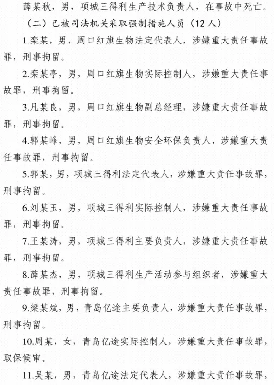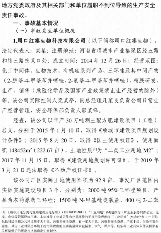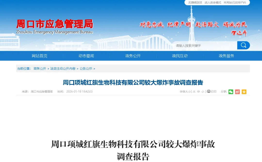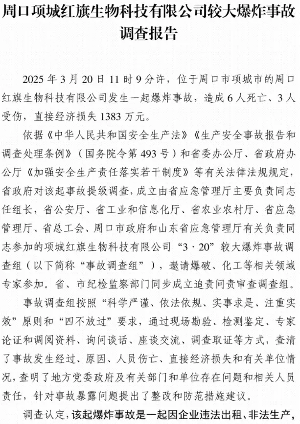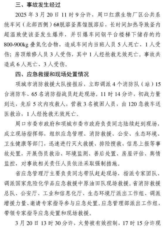2025年3月20日11时9分许,位于周口市项城市的周口红旗生物科技有限公司发生一起爆炸事故,造成6人死亡、3人受伤,直接经济损失1383万元。