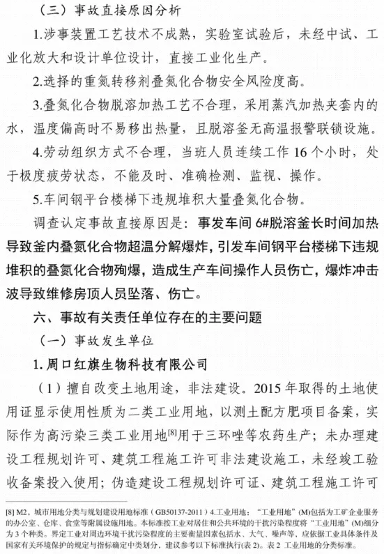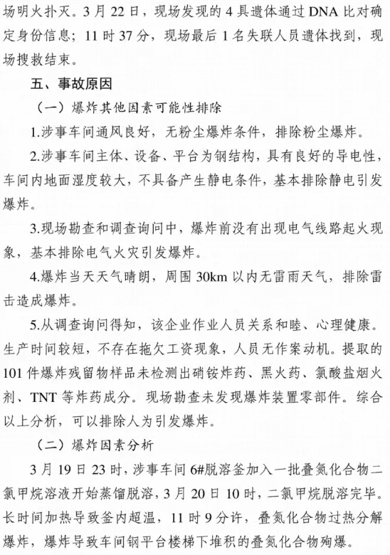 调查认定事故直接原因是:事发车间6#脱溶釜长时间加热导致釜内叠氮化合物超温分解爆炸,引发车间钢平台楼梯下违规堆积的叠氮化合物殉爆,造成生产车间操作人员伤亡,爆炸冲击波导致维修房顶人员坠落、伤亡。