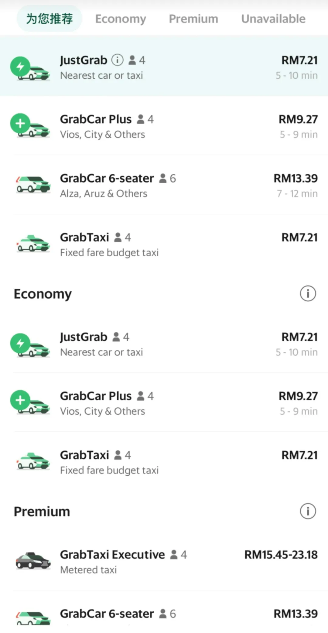网约车(Grab,非高峰起步价):8-10马币