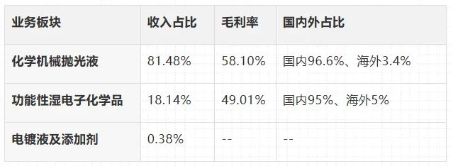 先进封装抛光液 :2.5D/3D TSV抛光液国内市占率第一。
