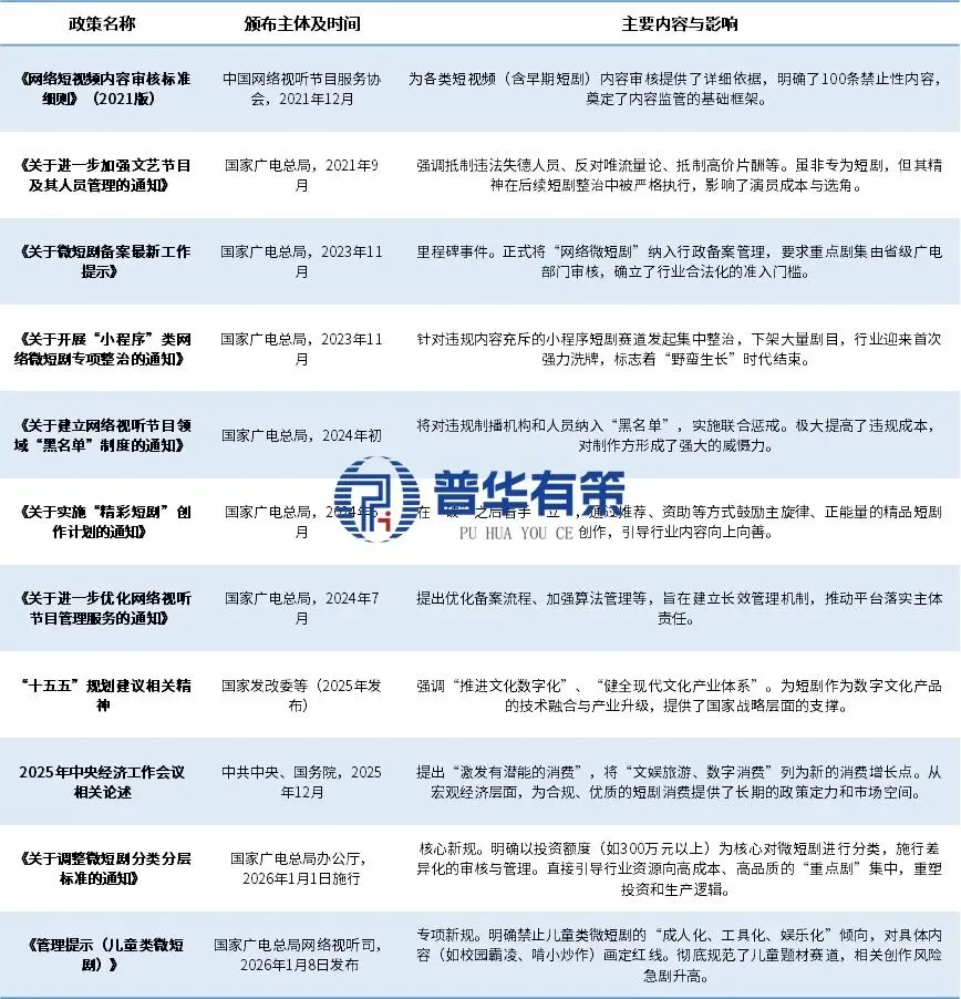 政策是影响行业走向的最强外部变量。一方面,从“十四五”文化数字化战略到2025年中央经济工作会议提出“激发有潜能的消费”,国家层面对数字文化消费的鼓励为行业提供了长期的“天花板”支撑。另一方面,持续强化的监管(如下表政策汇总)为行业设置了清晰的“地板”和“红线”。2026年初实施的新分类分层标准及儿童剧管理提示,标志着监管进入“精准分层、重点管理”的新阶段,直接引导资源向“重点剧”倾斜,并彻底规范了特定题材的创作空间。
