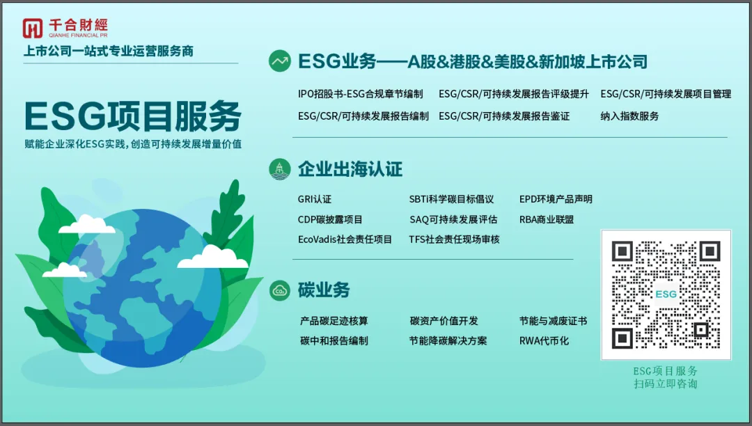 千合财经丨上市公司一站式专业运营服务商:始于对趋势的敏锐洞察,成于对企业的深度赋能。自2013年起,我们专注为港股、A股、美股及新加坡上市公司提供一站式ESG解决方案。欢迎关注、咨询!