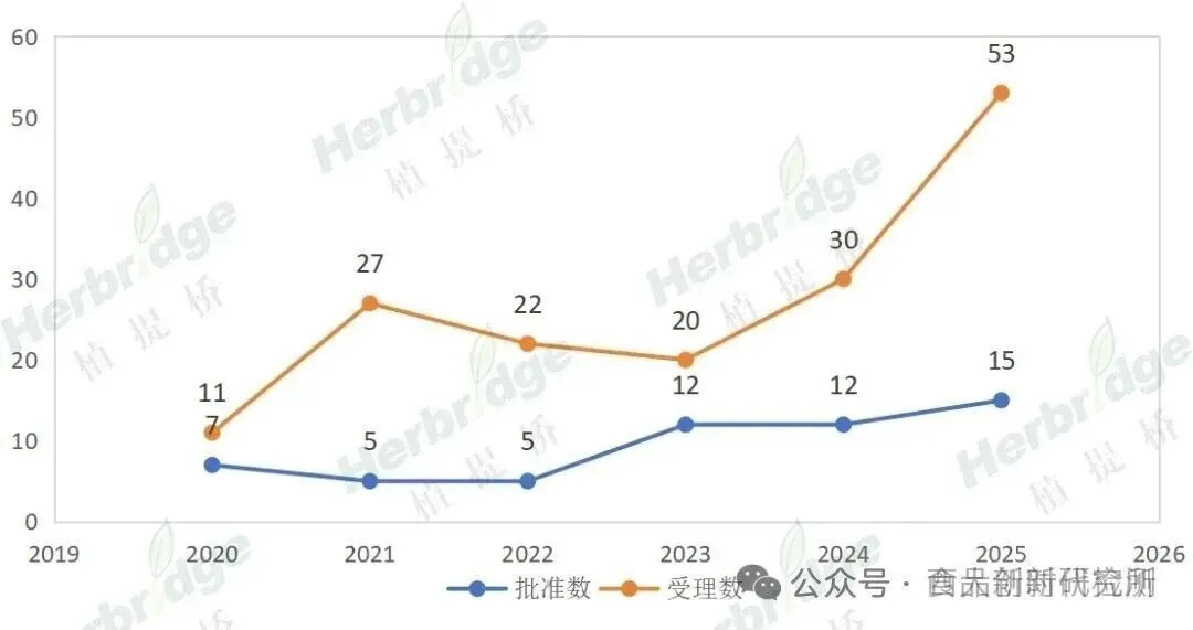 截至2025年底,卫健委共受理53例新食品原料申请,同比增加了76.7%,创下近年来新高。