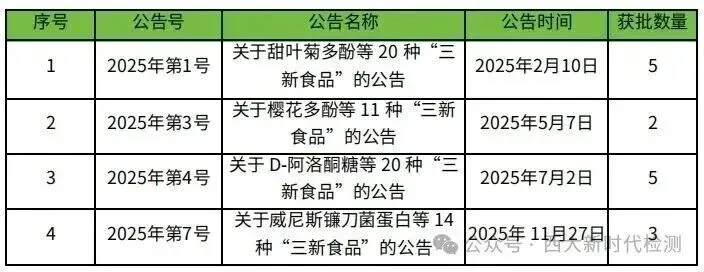2025年,国家卫健委先后发布4个“三新食品”公告(第1、3、4、7号),共批准15例新食品原料,与2024年获许可的12个新食品原料相比较,同比增加了25%。其中黑麦花粉修订了原2023年第3号公告(原公告相关内容作废)。值得注意的是:首个生物合成的D-阿洛酮糖成功获批,标志着合成生物学原料在法规路径上的进一步突破。